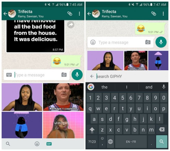 Sin embargo, hay buenas noticias para los usuarios de WhatsApp, pues el trabajo en el soporte de GIFs no quedó varado. La última beta para Android del servicio de mensajería instantánea incluye un buscador de GIFs potenciado por Giphy (vía Android Police). Así, los usuarios no seguirán dependiendo de las animaciones guardadas en sus teléfonos.